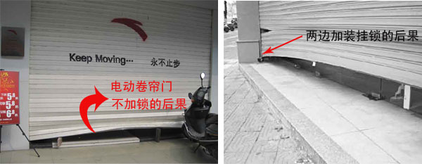 兩邊加裝掛鎖:這是有些人為了解決上面的問題的處理方法,想達到防盜的目的,然而這樣的方法也是不正確的,卷簾門的門體跨度大,也是很容易被撬開用磚頭頂住,人就可以爬進去,而且兩邊加鎖,電動門忘記先開鎖就按了遙控器上行,卷簾門就會被拉壞。